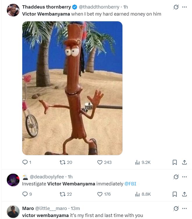 已经有很多的美国球迷纷纷炮轰文班亚马:请联盟调查一下文班亚马吧,当我把自己的血汗钱放在你身上时..........这是我第一次信任文班亚马也是最后一次!